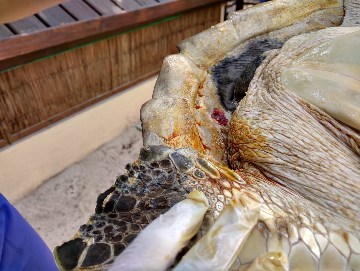 Seaheart (or Mr. Seaheart as he is affectionately known around the centre), was due for some wound care. He is an adult male Olive Ridley, with one flipper amputated, and a ligature wound on the remaining flipper where he was entangled in nets. For wound care, he has to be removed from the tank. Lead vet Claire took a look, and treated his wounds with a solution of Gentian Violet which is a bright purple antiseptic dye used to treat fungal infections of the skin, and also has antibacterial properties.
